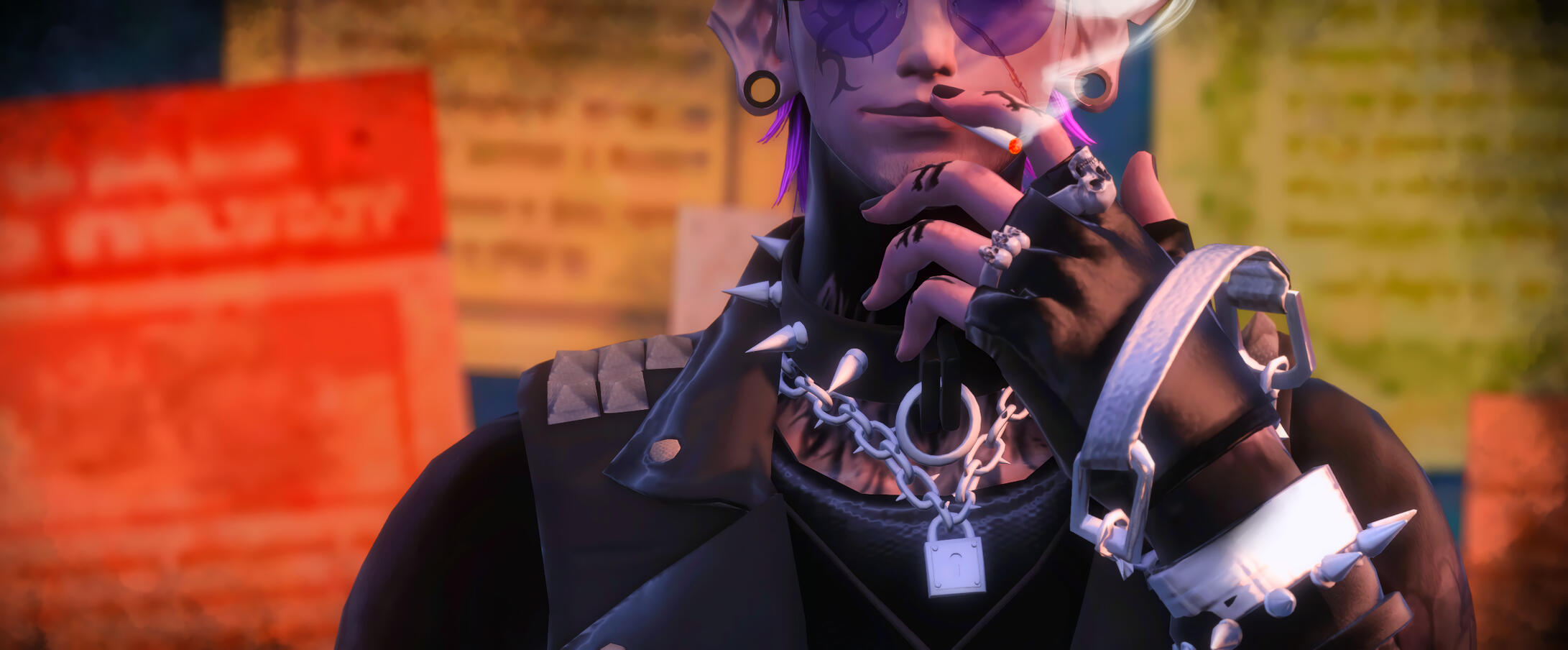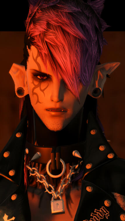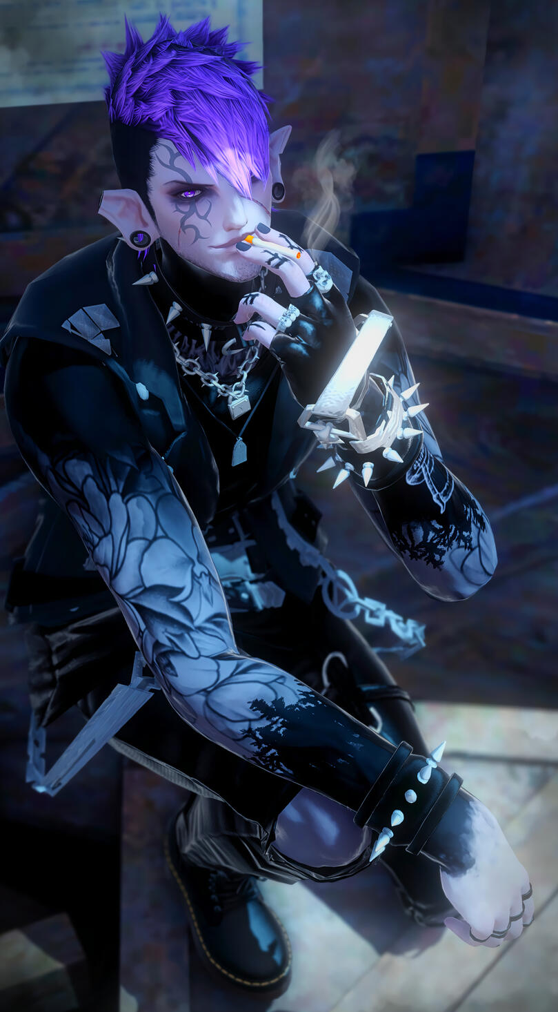 At a glance, his skintone sets him apart from all other natural-born Duskwights; light-grey with a hint of lavender undertone. A stark difference from the usual dark-grey Duskwight skintones.Vandraux occasionally dresses himself up in ragged, tattered apparel. His usual outfits consists of ripped jeans complimented with leather jackets or denim vests, fishnets, and a whole lot of spikes and studs.Scars and stab wounds litter his body, and his tattoos refines his skin like artwork. Blacked out parts aids in making the floral design pop out around his body; an inked homage to his home in the Black Shroud. Even at farther distances, his stretched earlobes catches the attention of many. Occasionally, two rings are seen pierced on the end of his right brow.His mullet-mohawk is the staple of his appearance. He's never seen without his iconic hair, even in wanted posters that scatter the walls of cities he gained notoriety in.Overtime, his influence with his Avatar and as a Reaper becomes obvious with the 'Void corruption' spreading from his right chest to his entire right arm and hands. His eyes becomes a bright and vibrant purple with black slit pupils.